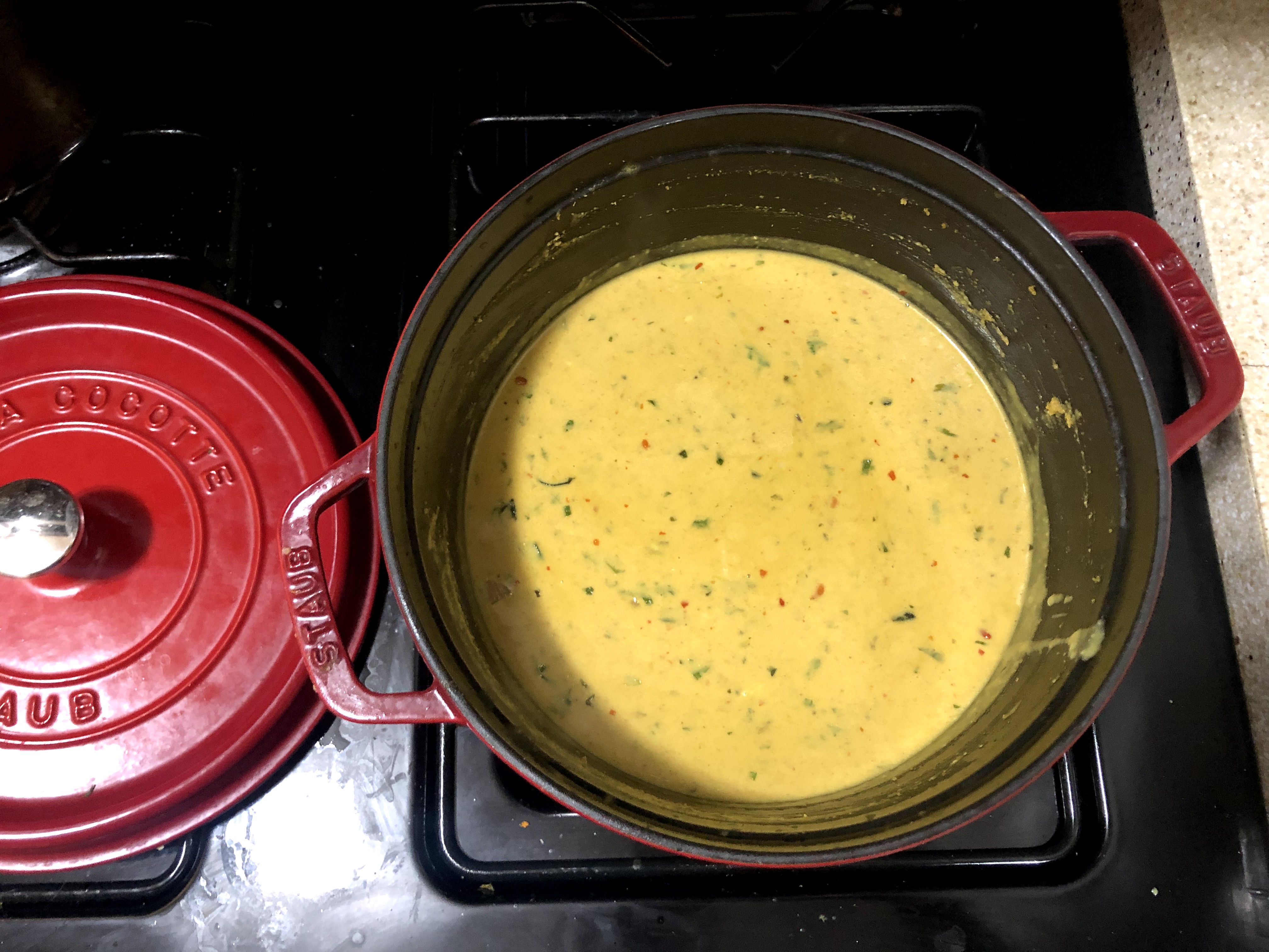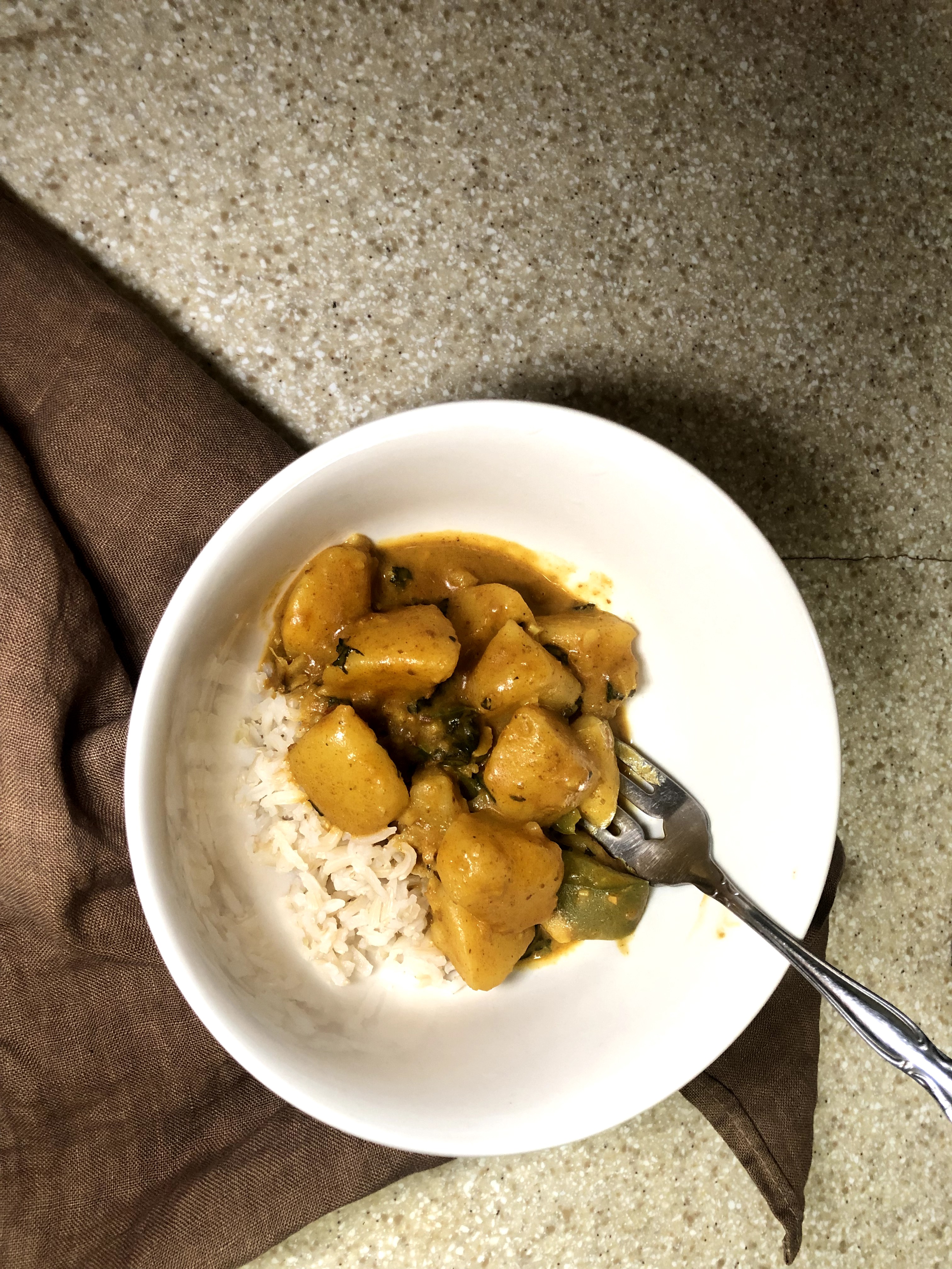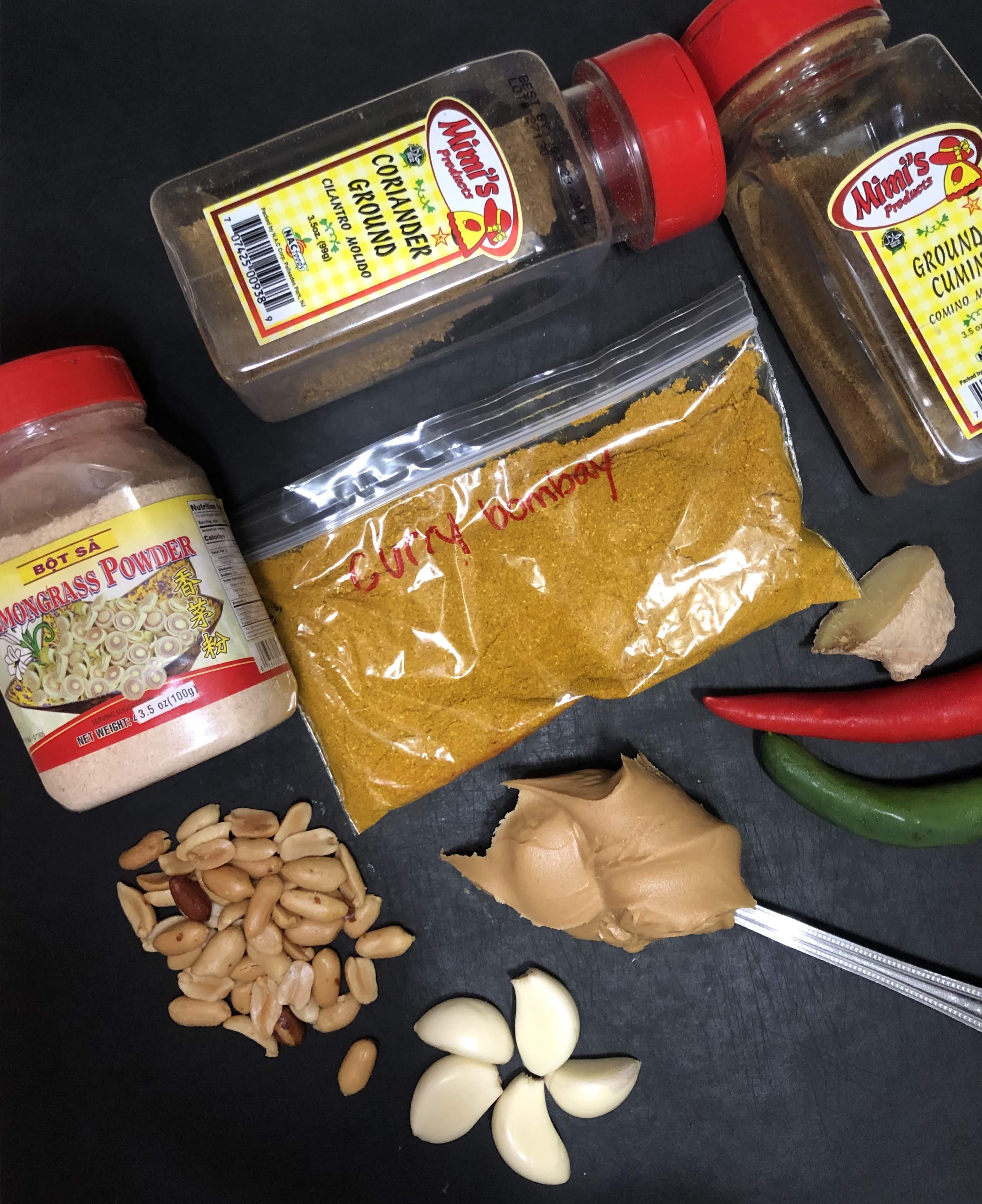 Heat the vegetable oil in dutch oven over medium heat, and then add the chopped garlic. Toss well and once garlic is very fragrant, prepare your curry paste by adding in all the seasonings (cumin, coriander, lemongrass, ginger, curry powders), mix into the oil to create a pastey texture. This is the moment where you will add in any meat options or tofu. Add half the can of coconut milk and stir in the spoonfuls of peanut butter, whisk until fully combined. Add the remainder of coconut milk and coconut cream. If mixture is too thick for you add water to thin it out. Bring to a gentle boil and adjust heat to maintain moderate simmer. Cook about 10 minutes until meat is cooked through. Stir in lime juice, fish sauce, sprinkle of brown sugar, then remove from heat and cover to keep curry warm while you prepare your noodles, potatoes, rice, or steamed veggies!