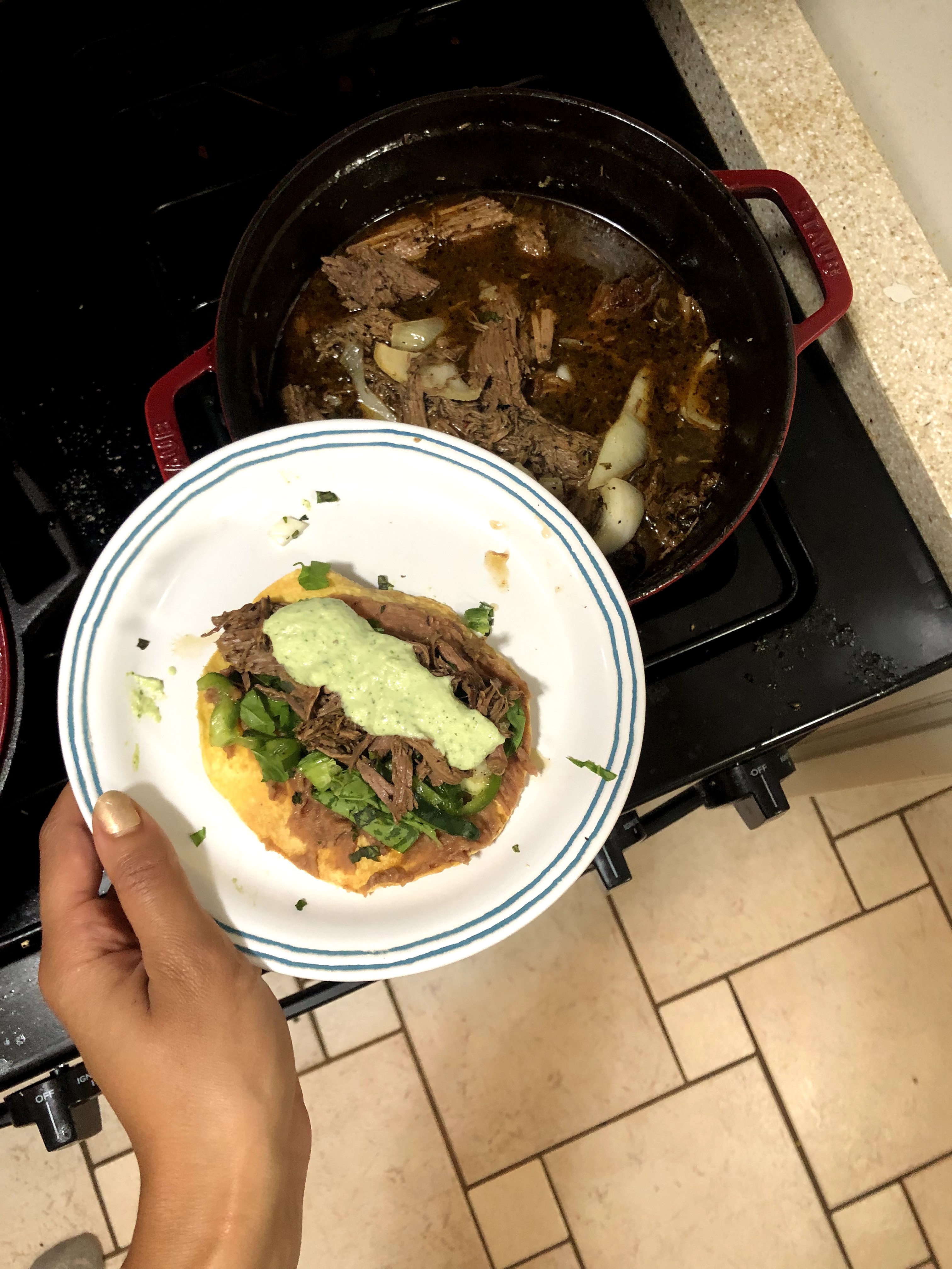 Wash the roast and pat dry with paper towel. Heat dutch oven to medium-high heat. Add a little cooking oil. Sprinkle garlic powder, sumac, black pepper,and Herbes De Provence on the roast. Sear both sides. Lower the heat and add the Worcestershire sauce. Cover and allow to cook for about 2 hours (depending on the size of your roast) on low heat. Keep roast submerged in water. The longer it cooks the more tender it will be and easier to shred apart. Put together your tacos with beans, lettuce, pico de gallo, jalapenos, and an avocado sour cream sauce.
