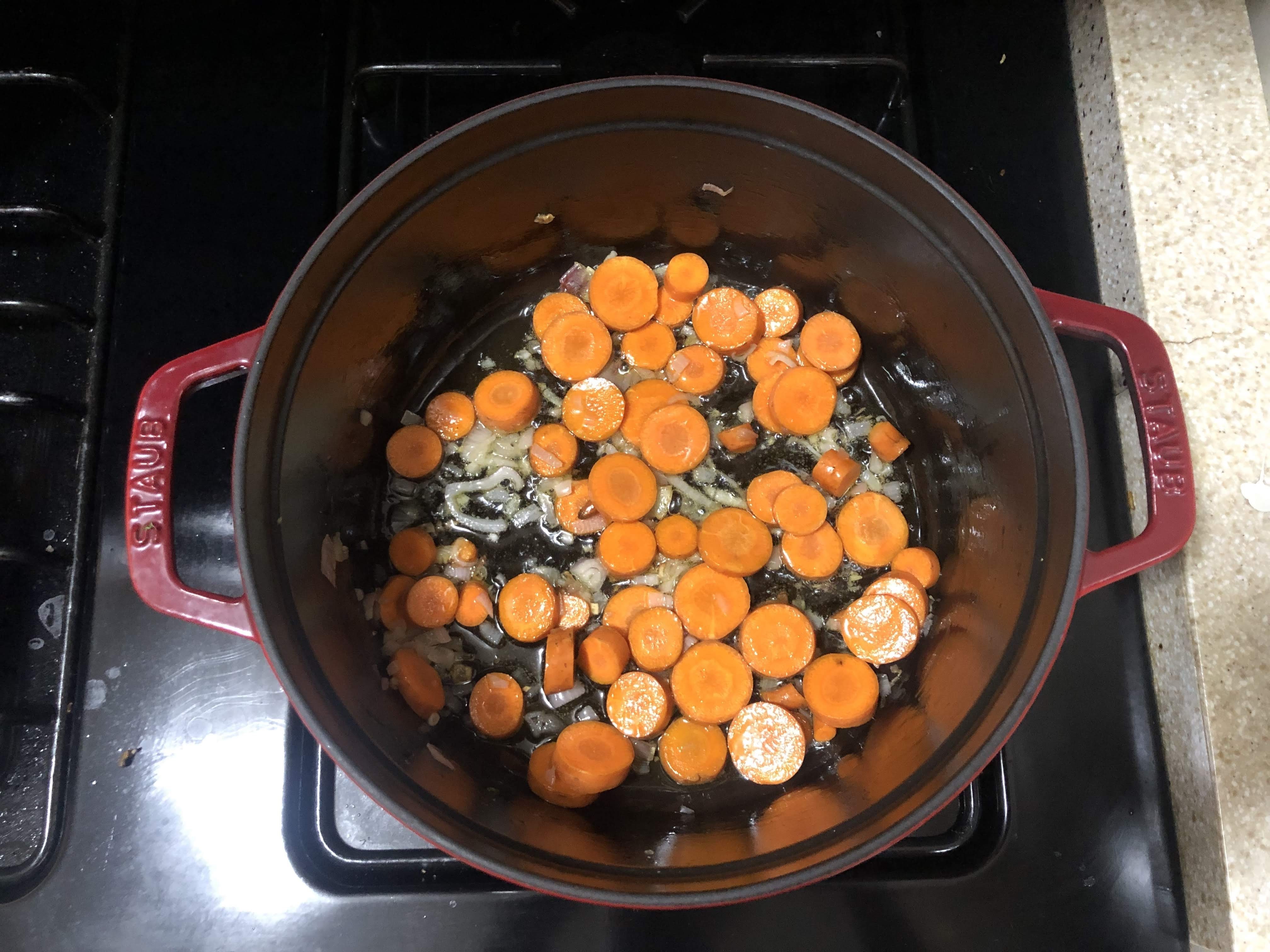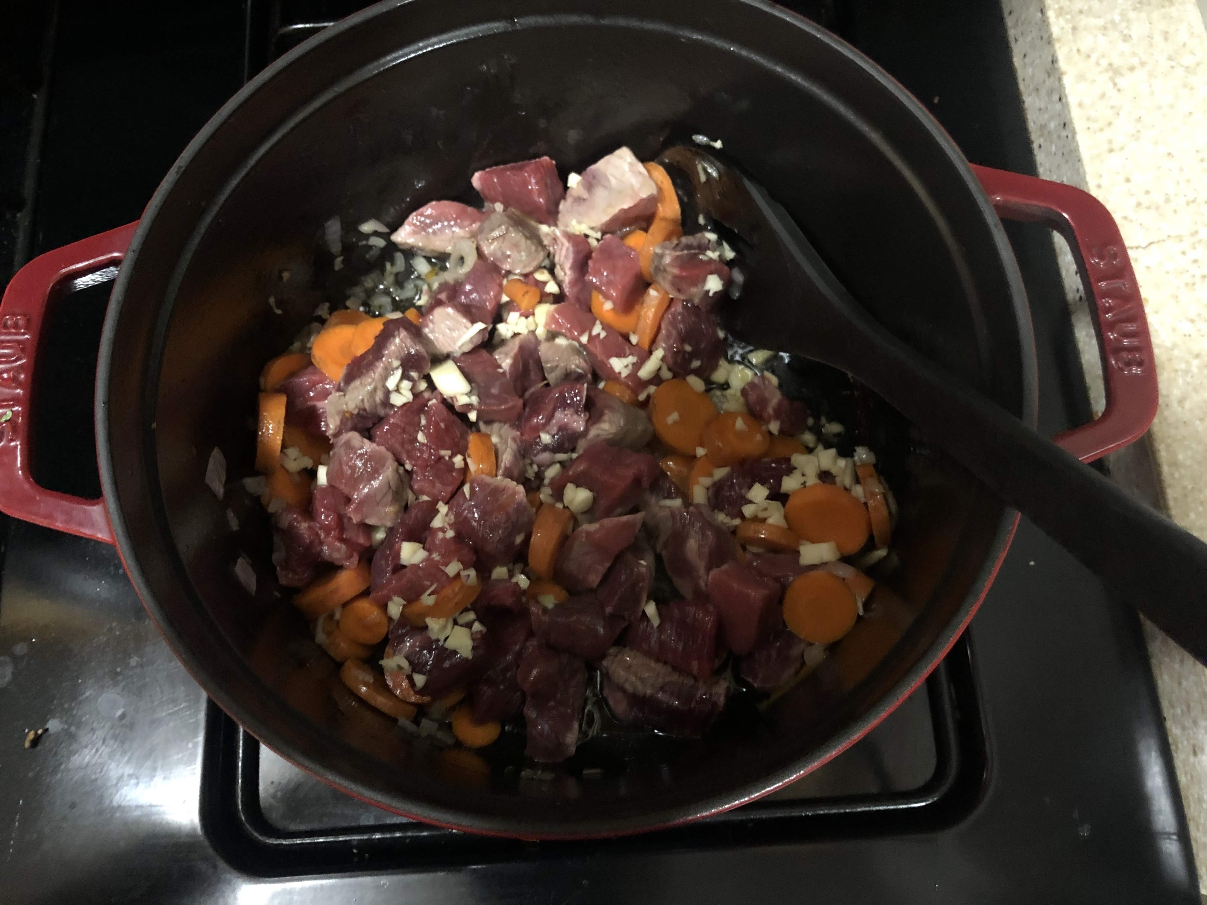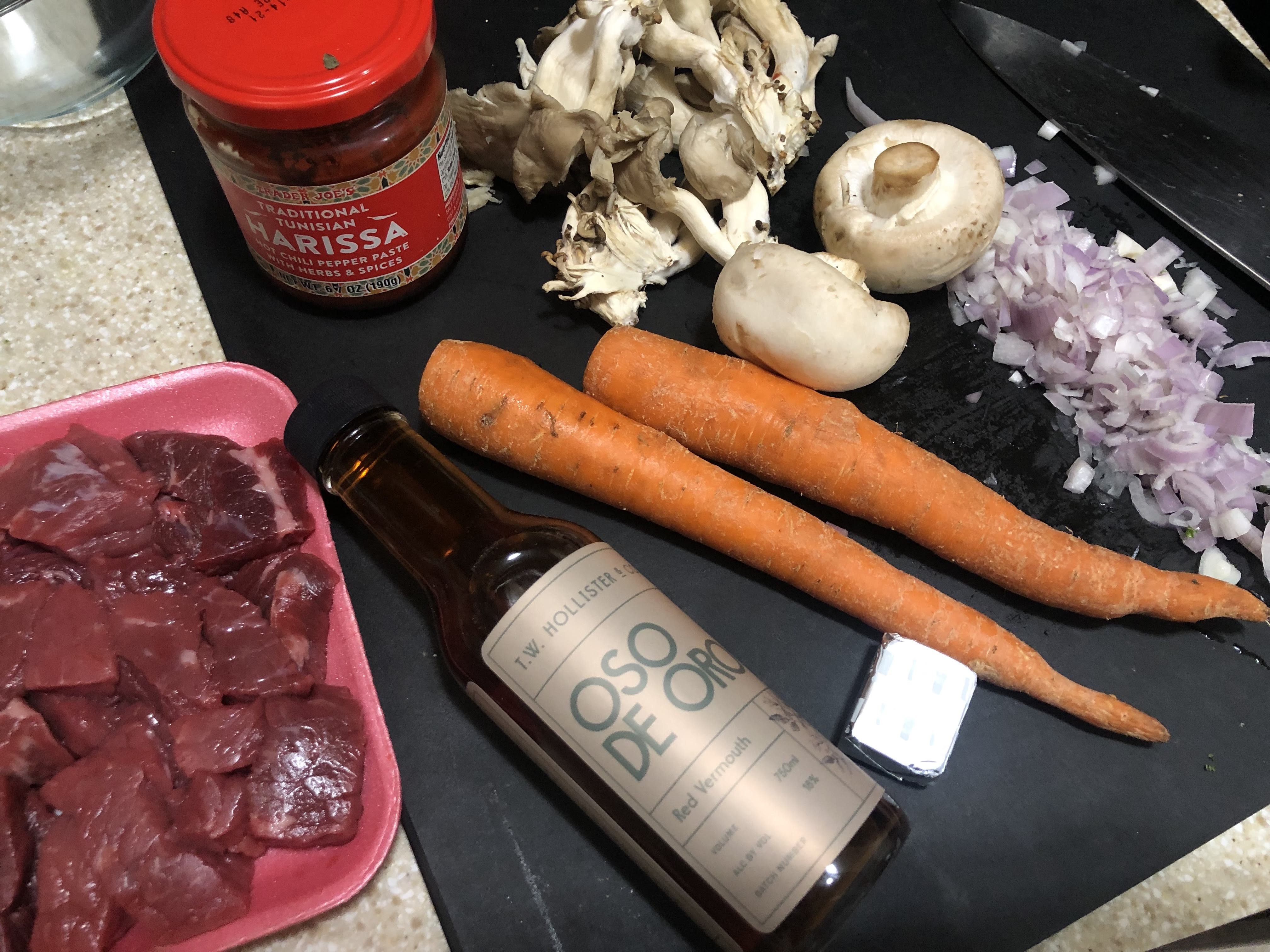 Prepare dutch oven on the stove at medium heat and add cooking oil. Clean beef chuck and pat dry with paper towel. Sprinkle with salt and pepper. In single layers, sear the beef in the hot oil for 3 to 5 minutes, brown all sides. Remove the seared cubes and set aside. Toss the carrots, and onions in the pan with all the beef juices. Stir occasionally, until the onions are lightly browned. Add the garlic and cook for 1 more minute until fragrant. Add the vermouth, and stir. Add the tomato paste and stir until dissolved. Bring to a simmer, cover the pot tight. Place the pot into your oven at 250 degrees for about 1hr 30mins, or until beef chuck is tender.