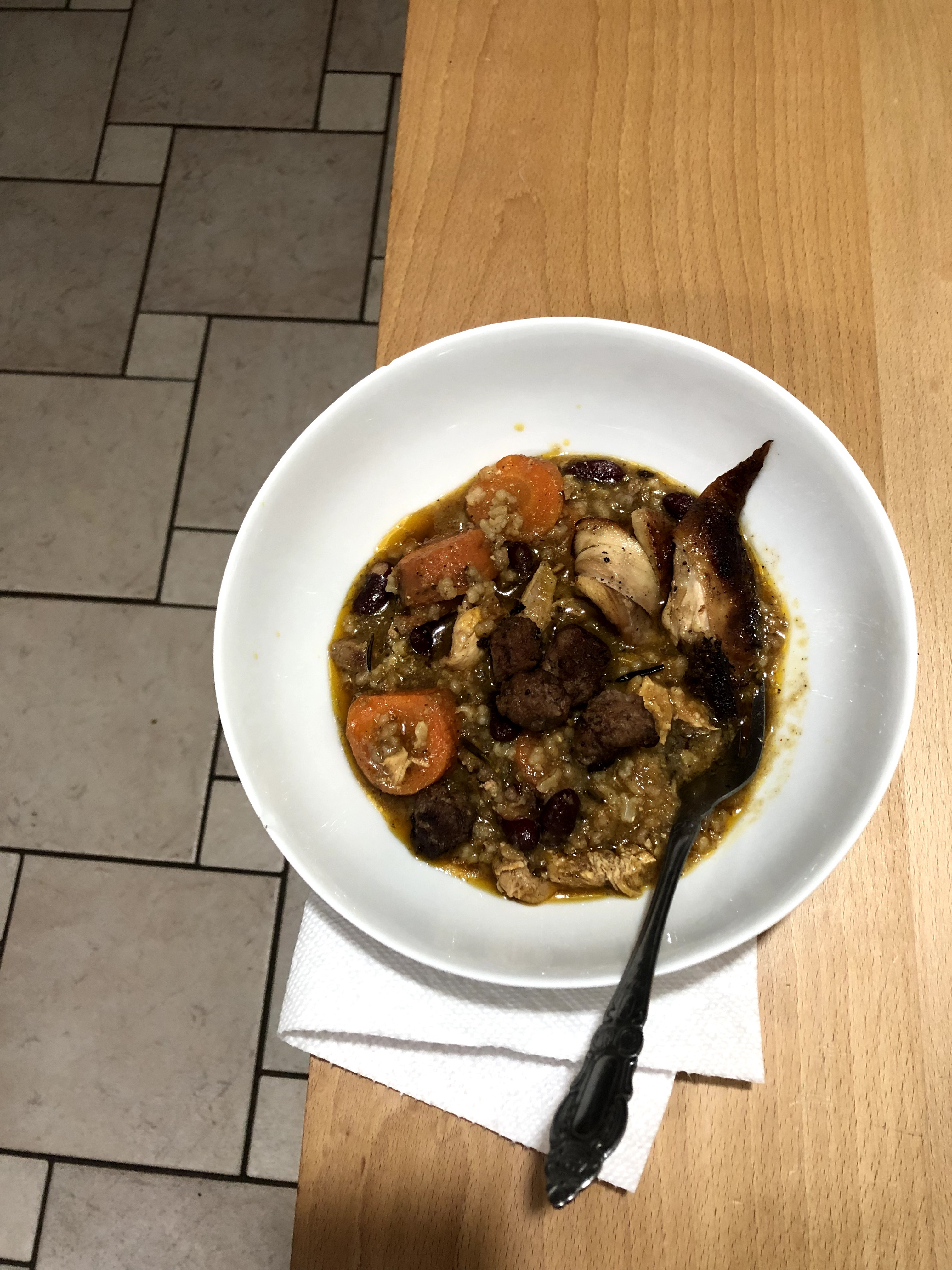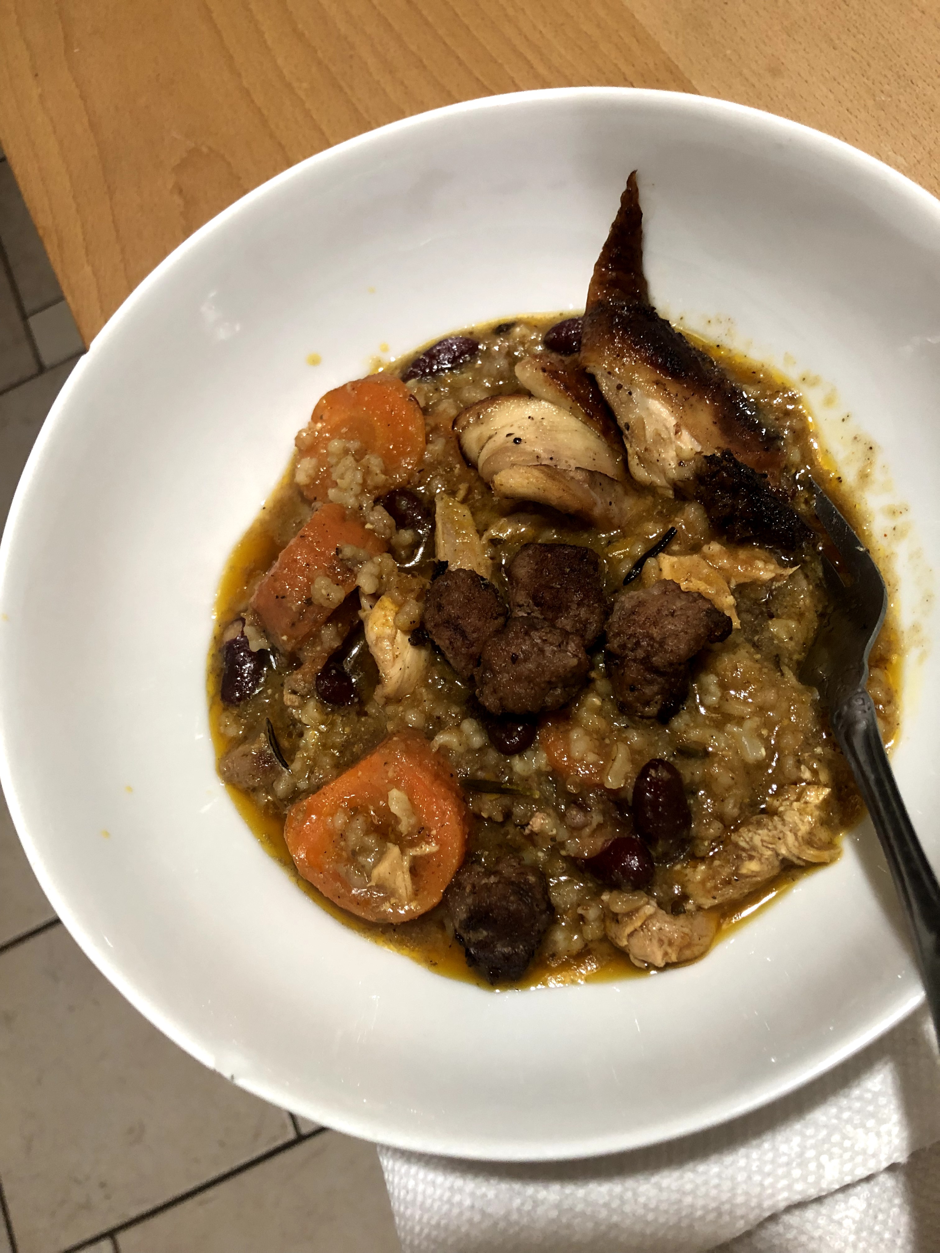 Previously roast Roast Chicken or Turkey (get skin extra crispy to hold up in the stew. By roasting meat with oil and salt to help dry out skin)