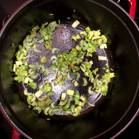 In the same pan, heat a little oil over medium heat and toast celery. Cook for about a minute and a half. Remove and set aside.