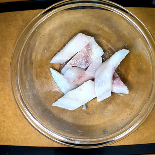 Pat fish dry to remove excess water and place in a large bowl. Add a sprinkle of salt, 1/4 cup rice wine vinegar, and a tablespoon of cornstarch. Stir until mixed well. Wrap the bowl with plastic wrap and place in the fridge.